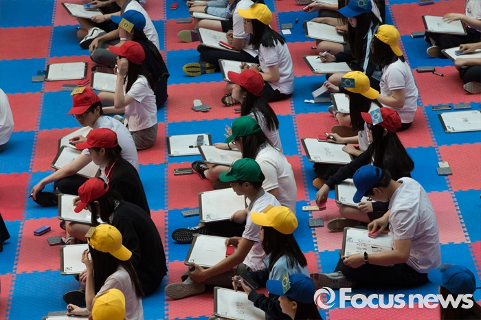 (서울=포커스뉴스) 24일 오후 서울 강북구 신일중학교 체육관에서 열린 근현대사기념관 개관 기념 '역사 골든벨'에 참석한 학생들이 본선 골든벨 퀴즈를 풀고 있다.