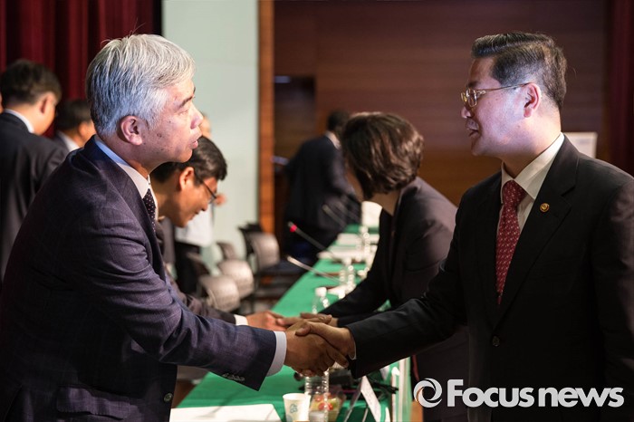 (서울=포커스뉴스) 24일 오후 서울 중구 포스트타워에서 열린 부정청탁 및 금품 등 수수 금지에 관한 법률(일명 김영란법) 입법예고안에 대한 공청회에 참석한 성영훈 국민권익위원회 위원장이 공청회가 끝나고 토론자들과 악수하고 있다.