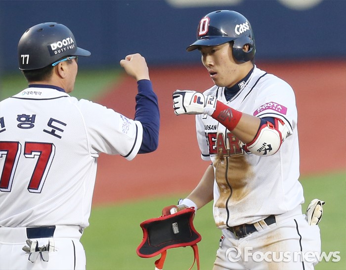 (서울=포커스뉴스) 24일 서울 잠실구장에서 열린 2016프로야구 kt-두산 경기 3회말 두산 선두타자 허경민이 우중간 펜스 앞에 떨어지는 3루타를 치고 전형도 코치와 주먹을 마주치고 있다.