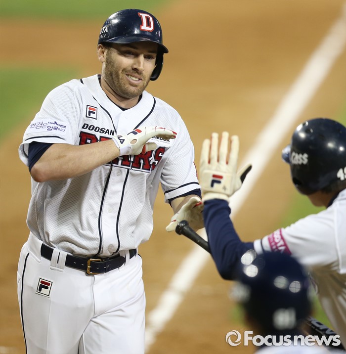 (서울=포커스뉴스) 24일 서울 잠실구장에서 열린 2016프로야구 kt-두산 경기 4회말 2사 3루에서 두산 에반스가 중월 2점 홈런을 치고 동료들의 환영을 받으며 밝은 표정으로 홈인하고 있다.