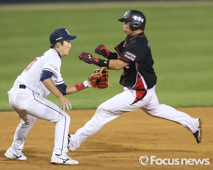 (서울=포커스뉴스) 24일 서울 잠실구장에서 열린 2016프로야구 kt-두산 경기 6회초 1사 1,3루에서 kt 전민수의 2루수 옆 안타때 1루주자 박경수가 3루로 뛰고 있다.
