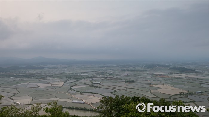 (철원=포커스뉴스) 입하와 소만을 지나 망종으로 향하는 24일 오후 강원도 철원 소이산 전망대에서 바라본 철원평야의 논이 석양에 물들고 있다.