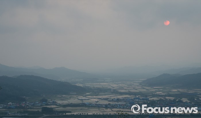 (철원=포커스뉴스) 입하와 소만을 지나 망종으로 향하는 24일 오후 강원도 철원 소이산 전망대에서 바라본 철원평야의 논이 석양에 물들고 있다.