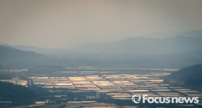 (철원=포커스뉴스) 입하와 소만을 지나 망종으로 향하는 24일 오후 강원도 철원 소이산 전망대에서 바라본 철원평야의 논이 석양에 물들고 있다.