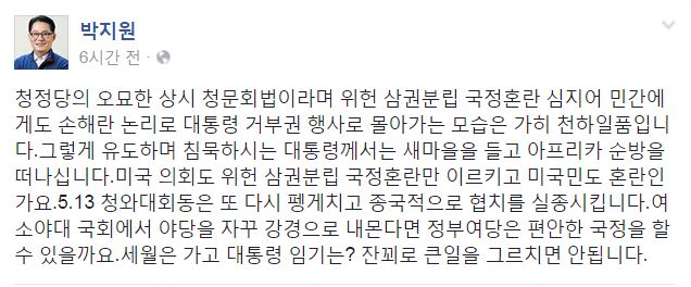 특히 그는 "(거부권 행사는) 5·13 청와대 회동을 또 다시 팽개치고 종국적으로 협치를 실종시킨다"라고 지적한 뒤 "여소야대 국회에서 야당을 자꾸 강경으로 내몬다면 정부여당은 편안한 국정을 할 수 있을까"라고 경고했다.