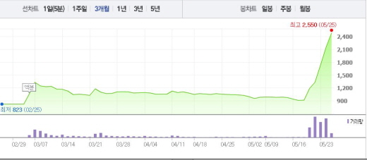 이는 1달 전 주가인 4월25일(1055원)과 비교했을 때 2.36배 상승한 수치다.