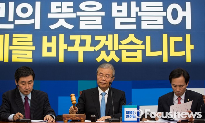 (서울=포커스뉴스) 김종인(가운데) 더불어민주당 비상대책위 대표가 25일 오전 서울 여의도 국회에서 열린 비상대책위원회의에 참석해 의사봉을 두드리고 있다.