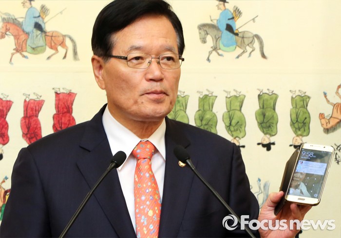 (서울=포커스뉴스) 정의화 국회의장이 25일 오전 서울 여의도 국회에서 퇴임 기자회견에 앞서 시간이 안됐다며 핸드폰을 들어보이고 있다. 오는 29일 임기 종료를 앞둔 정 의장은 이날 회견에서 19대 국회 후반기 국회의장직을 수행하며 느낀 소감 등을 전했다.