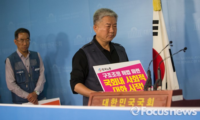 (서울=포커스뉴스) 김동만 한국노총 위원장이 '구조조정 해법 마련 국회내 사회적 대화 촉구 기자회견'을 하기 위해 25일 오전 서울 여의도 국회 정론관을 들어서고 있다.