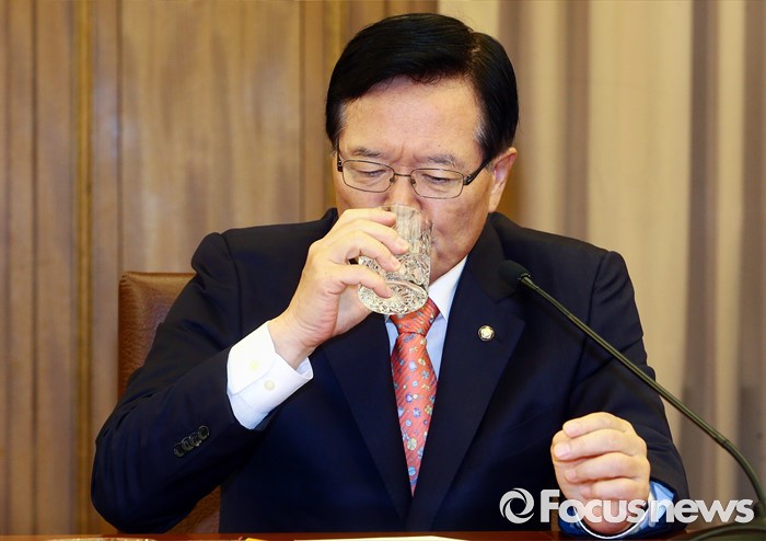 (서울=포커스뉴스) 정의화 국회의장이 25일 오전 서울 여의도 국회에서 퇴임 기자회견을 마친 뒤 취재진과 기자간담회 도중 물을 마시고 있다. 오는 29일 임기 종료를 앞둔 정 의장은 이날 회견에서 19대 국회 후반기 국회의장직을 수행하며 느낀 소감 등을 전했다.
