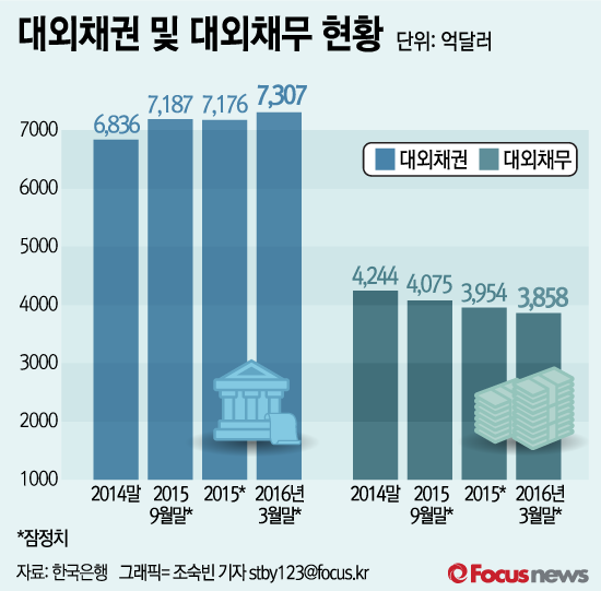 (서울=포커스뉴스) 25일 한국은행이 발표한 ‘3월말 국제투자대조표(잠정)’에 따르면 한국이 외국으로부터 받아야 할 대외채권은 7307억달러로 지난해 말보다 132억달러 증가했다. 반면 한국이 갚아야 하는 대외채무는 3858억 달러로 3개월 동안 96억달러 감소했다.