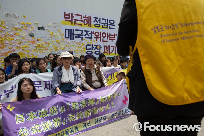 (서울=포커스뉴스) 25일 오전 서울 종로구 옛 일본대사관 앞에서 열린 '제1232차 일본군 위안부 문제해결을 위한 정기 수요시위'에 김복동(왼쪽), 길원옥 할머니가 사회자의 발언을 듣고 있다.