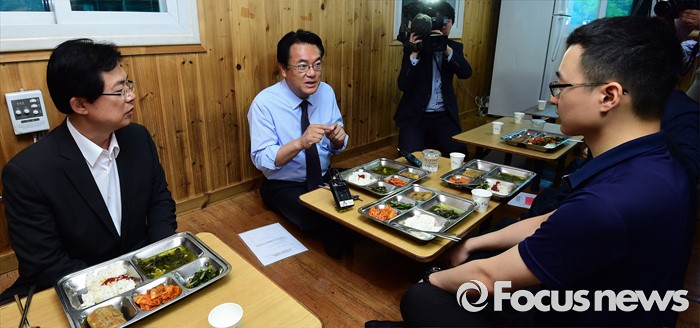(서울=포커스뉴스) 정진석 새누리당 원내대표가 25일 오후 서울 여의도 당사 앞 경비 의경대를 방문해 식사를 하며 의경들을 격려하고 있다.