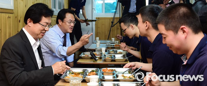 (서울=포커스뉴스) 정진석 새누리당 원내대표가 25일 오후 서울 여의도 당사 앞 경비 의경대를 방문해 식사를 하며 의경들을 격려하고 있다.