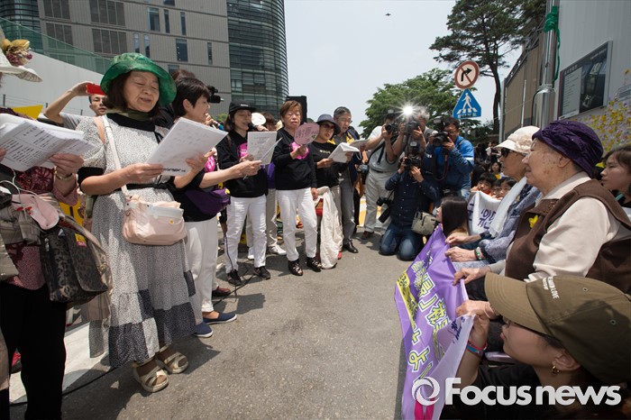 (서울=포커스뉴스) 25일 오전 서울 종로구 옛 일본대사관 앞에서 열린 '제1232차 일본군 위안부 문제해결을 위한 정기 수요시위'에 참석한 일본인들이 아침이슬을 합창하고 있다.