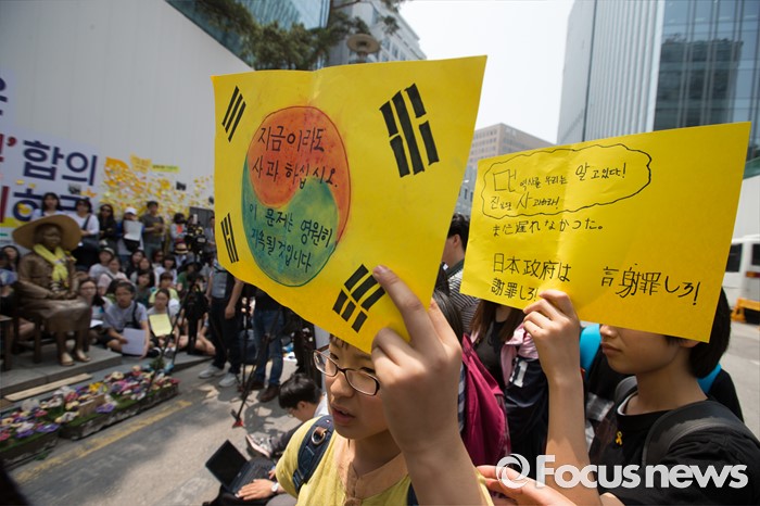 (서울=포커스뉴스) 25일 오전 서울 종로구 옛 일본대사관 앞에서 열린 '제1232차 일본군 위안부 문제해결을 위한 정기 수요시위'에 참석한 학생이 피켓을 들고 있다.