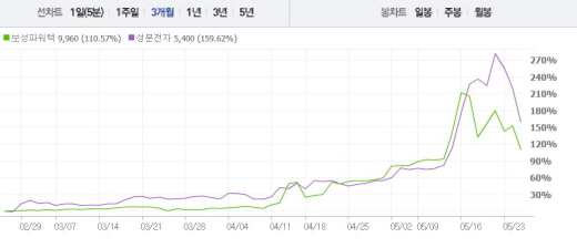 보성파워텍의 현재 주가는 2달 전 주가인 3월25일(4935원), 1달 전 주가인(4975원) 주가와 비교했을 때 2.01배, 1.99배 상승한 수치다. 성문전자 역시 2달 전 주가인 3월25일(2545원), 1달 전 주가인(3020원) 주가와 비교했을 때 2.12배, 1.78배 상승한 수치다.