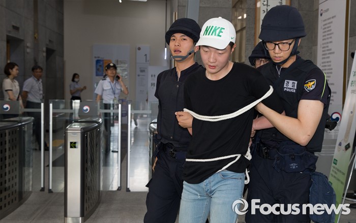 (세종=포커스뉴스) 25일 오후 세종시 정부세종청사에서 열린 '정부세종청사 군ㆍ관ㆍ경 통합 방호훈련'에서 청사에 난입한 남성을 체포하는 훈련이 실시되고 있다.