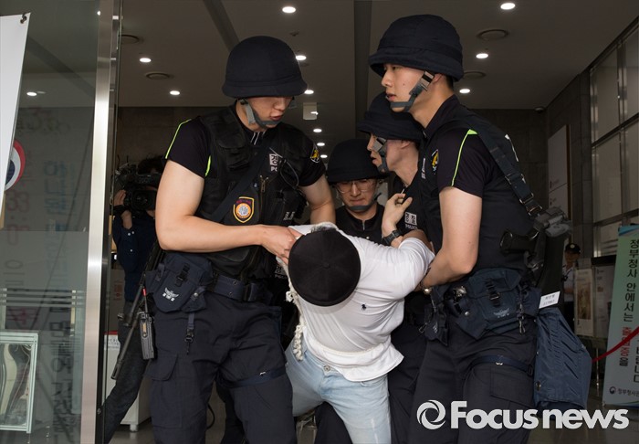 (세종=포커스뉴스) 25일 오후 세종시 정부세종청사에서 열린 '정부세종청사 군ㆍ관ㆍ경 통합 방호훈련'에서 청사에 난입한 남성을 체포하는 훈련이 실시되고 있다.