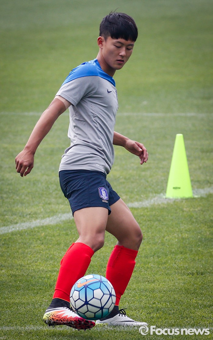 (파주=포커스뉴스) 이승우(18, 바르셀로나 후베닐A)가 25일 오후 경기도 파주 NFC에서 잉글랜드 U18(18세 이하) 대표팀과의 친선전을 앞두고 축구대표팀 선수들과 소집 훈련에 임하고 있다.