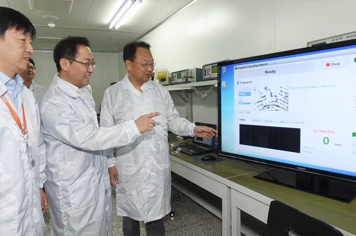 (성남=포커스뉴스) 유일호 부총리 겸 기획재정부 장관이 25일 벤처.창업 관련 현장방문의 일환으로 경기도 판교 테크노벨리 소재 (주)크루셜텍을 방문, 관계자로부터 제품과 연구시설의 설명을 듣고 있다. <사진제공=기획재정부>