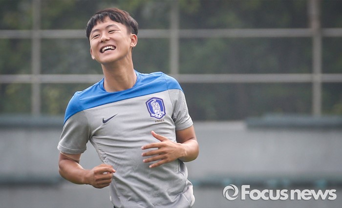 (파주=포커스뉴스) 이승우(18, 바르셀로나 후베닐A)가 25일 오후 경기도 파주 NFC에서 잉글랜드 U18(18세 이하) 대표팀과의 친선전을 앞두고 축구대표팀 선수들과 소집 훈련에 임하고 있다.