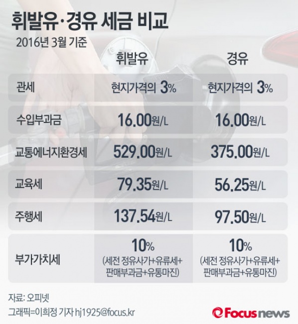 (서울=포커스뉴스) 오피넷에 따르면 휘발유 값에 포함된 교통에너지환경세는 529.00원/L으로 375.00원/L인 경유에 비해 약 200원 가량 비싼 것으로 나타났다.