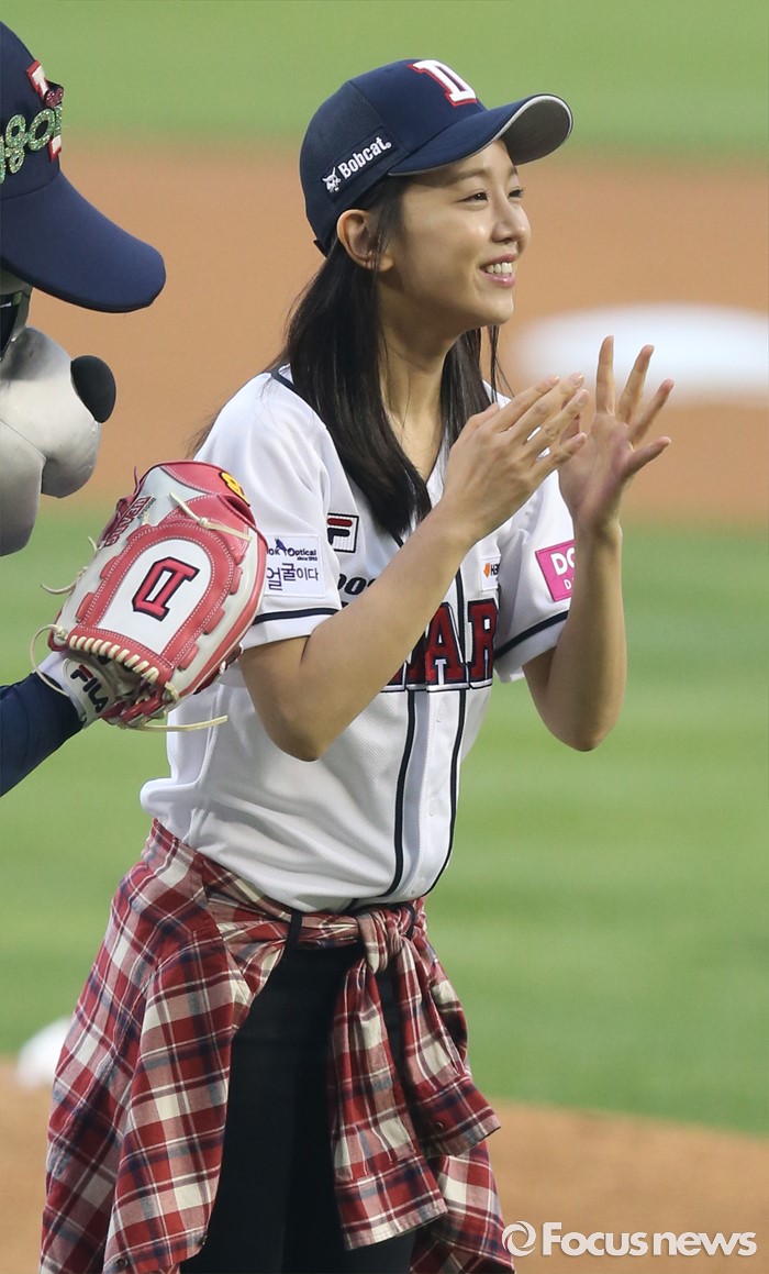 (서울=포커스뉴스) 25일 서울 잠실구장에서 열린 2016 프로야구 kt-두산 경기에 앞서 시구자로 나온 배우 신혜선이 관중에게 인사하고 있다.