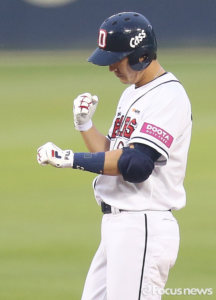 (서울=포커스뉴스) 25일 서울 잠실구장에서 열린 2016프로야구 kt-두산 경기 2사 1,3루에서 두산 김재호가 중견수 뒤로 빠지는 역전 2타점 2루타를 치고 두 주먹을 쥐며 기뻐하고 있다.