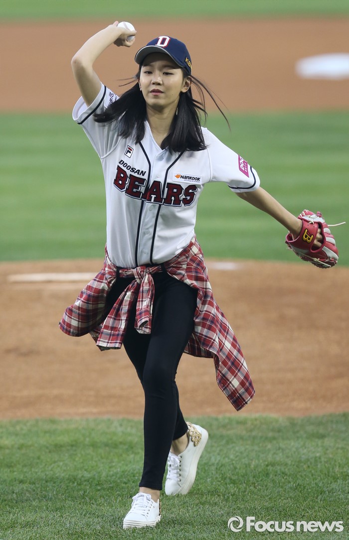 (서울=포커스뉴스) 25일 서울 잠실구장에서 열린 2016 프로야구 kt-두산 경기에 앞서 배우 신혜선이 시구하고 있다.