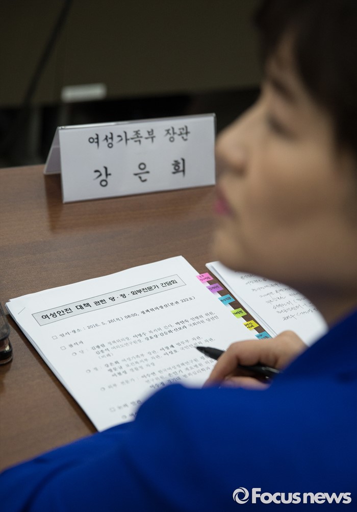 (서울=포커스뉴스) 강은희 여성가족부장관이 26일 오전 서울 여의도 국회에서 열린 여성안전대책간담회에 참석하고 있다.