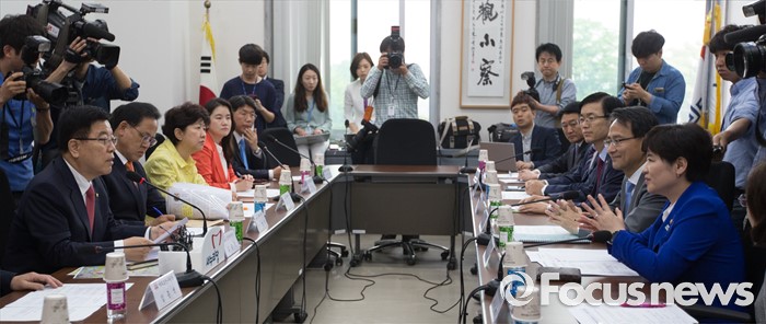 (서울=포커스뉴스) 김광림(왼쪽) 새누리당 정책위의장과 강은희(오른쪽) 여성가족부장관이 26일 오전 서울 여의도 국회에서 열린 여성안전대책간담회에 참석해 논의하고 있다.
