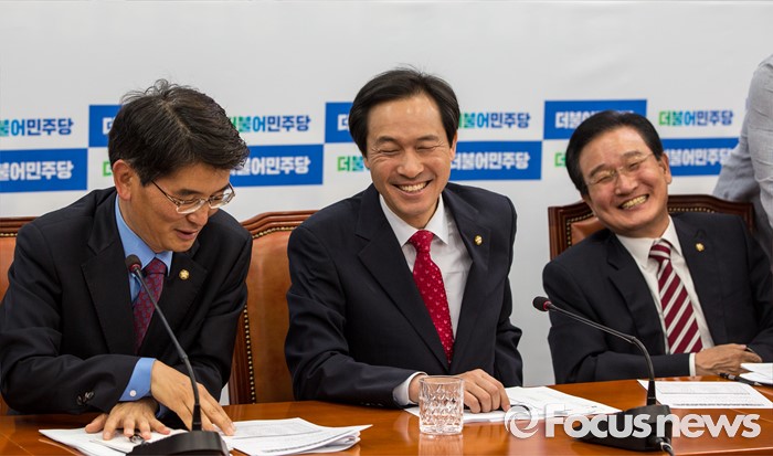 (서울=포커스뉴스) 우상호(가운데) 더불어민주당 원내대표와 박완주(왼쪽) 원내수석부대표, 변재일 정책위의장이 26일 오전 서울 여의도 국회에서 열린 정책조정회의에 참석해 대화를 나누고 있다.