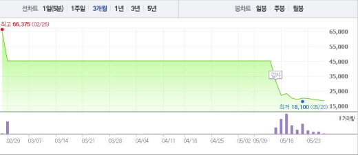현재 주가는 16일 2만2200원을 기록했던 주가와 비교했을 때 15.7% 하락한 수치다.