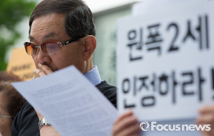 (서울=포커스뉴스) 26일 오전 서울 종로구 광화문 KT 앞에서 한국 원폭피해자와 시민사회단체가 오바마 미국 대통령의 한국 원폭 피해자들에 대한 공식 인정과 조사 및 사죄 촉구 기자회견을 하고 있다.