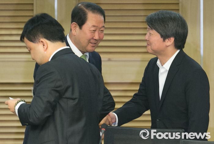 (서울=포커스뉴스) 26일 오전 서울 여의도 국회 의원회관에서 열린 광주 지역경제 활성화와 중국 관광객 유치 방안 포럼에 참석한 안철수(오른쪽) 국민의당 상임공동대표와 박주선 최고위원이 인사하고 있다.