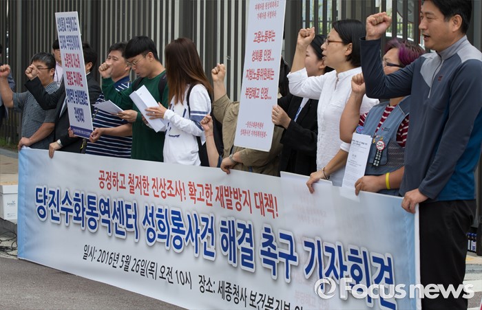 (세종=포커스뉴스) 26일 오전 세종시 정부세종청사 보건복지부 앞에서 당진수화통역센터 성희롱 사건 해결을 위한 충남지역 대책위원회 구성원들이 성희롱 사건 해결을 촉구하는 기자회견을 하고 있다.