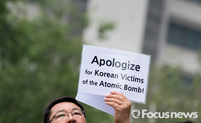 (서울=포커스뉴스) 26일 오전 서울 종로구 광화문 KT 앞에서 한국 원폭피해자와 시민사회단체가 오바마 미국 대통령의 한국 원폭 피해자들에 대한 공식 인정과 조사 및 사죄 촉구 기자회견을 하고 있다.