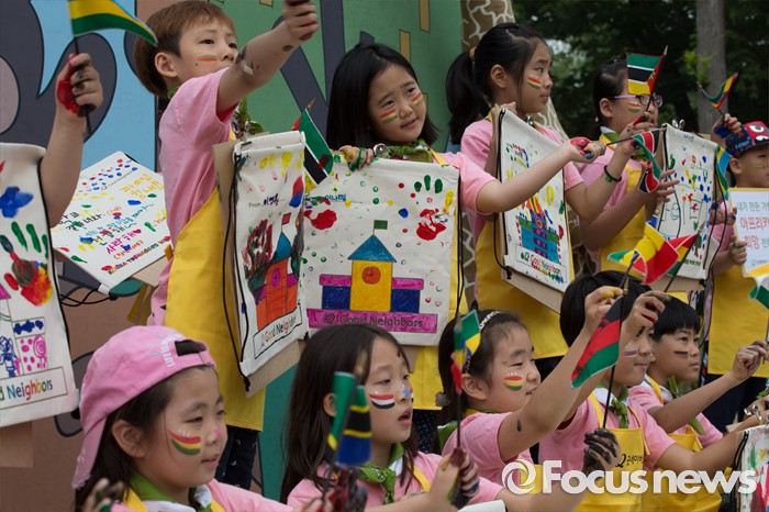 (서울=포커스뉴스) 26일 오전 서울 광진구 어린이대공원에서 열린 굿네이버스 '아프리카 희망학교 체험전'에서 초등학교 학생들이 아프리카에 보낼 가방을 완성한 후 기념촬영을 하고 있다.