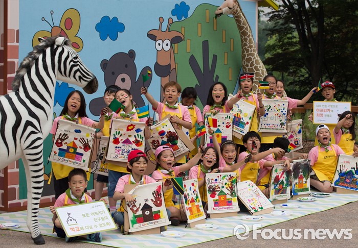 (서울=포커스뉴스) 26일 오전 서울 광진구 어린이대공원에서 열린 굿네이버스 '아프리카 희망학교 체험전'에서 초등학교 학생들이 아프리카에 보낼 가방을 완성한 후 기념촬영을 하고 있다.