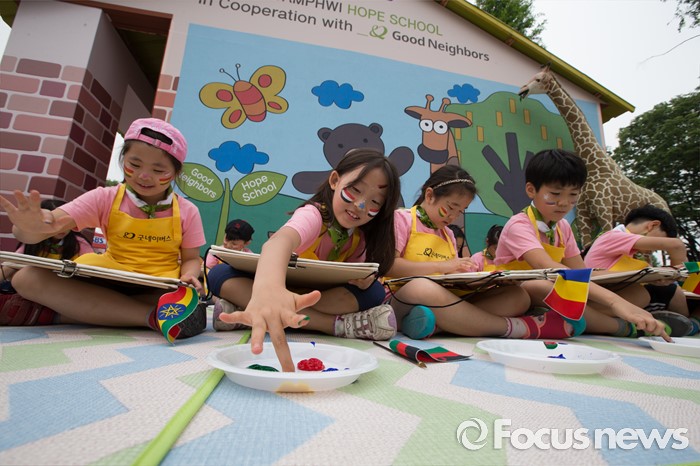 (서울=포커스뉴스) 26일 오전 서울 광진구 어린이대공원에서 열린 굿네이버스 '아프리카 희망학교 체험전'에서 초등학교 학생들이 아프리카에 보낼 가방에 그림을 그리고 있다.