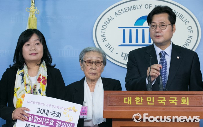 (서울=포커스뉴스) 26일 오전 서울 여의도 국회 정론관에서 홍익표(오른쪽) 더불어민주당 의원과 윤미향(왼쪽) 한국정신대문제대책협의회 상임대표, 위안부 피해자 김복동 할머니 등이 한일 일본군 '위안부' 합의 무효 및 재협상을 위한 20대 국회의 역할 촉구 기자회견을 하고 있다.