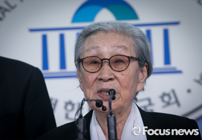(서울=포커스뉴스) 26일 오전 서울 여의도 국회 정론관에서 홍익표, 이인영 더불어민주당 의원과 윤미향 한국정신대문제대책협의회 상임대표, 위안부 피해자 김복동 할머니 등이 한일 일본군 '위안부' 합의 무효 및 재협상을 위한 20대 국회의 역할 촉구 기자회견을 하고 있다.