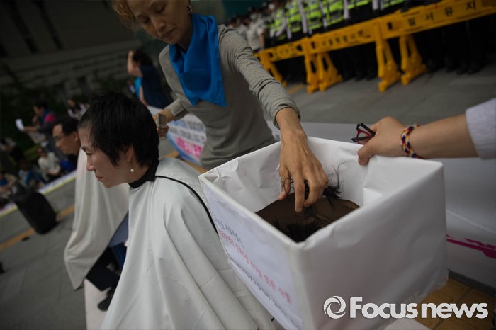 (서울=포커스뉴스) 26일 오전 서울시청 정문앞에서 전국장애인 부모연대와 서울특수학교학부모협의회원들이 발달장애인 정책 수립을 촉구하며 삭발식을 하고 있다.