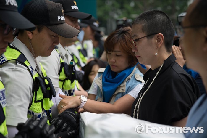 (서울=포커스뉴스) 26일 오전 서울시청 정문앞에서 전국장애인 부모연대와 서울특수학교학부모협의회원들이 발달장애인 정책 수립을 촉구하며 삭발식을 한 뒤 항의의 의미로 머리카락을 서울시에 전달하려고 하자 경찰병력이 막아서고 있다.