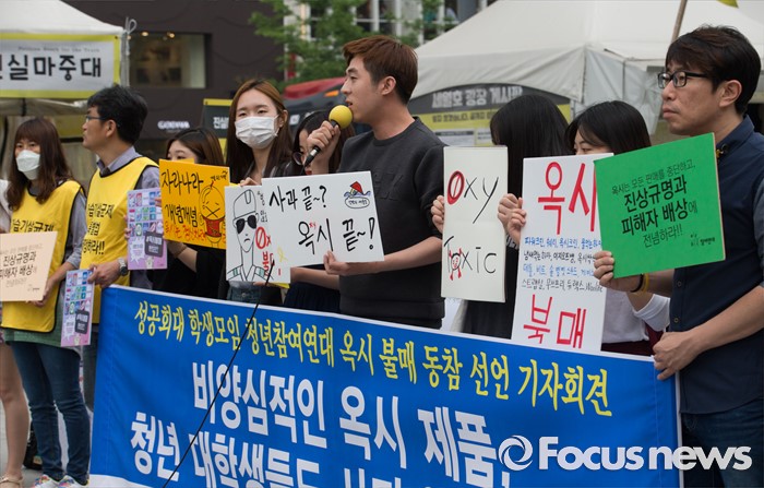 (서울=포커스뉴스) 26일 오후 서울 광화문광장에서 성공회대 학생모임과 청년참여연대 관계자들이 옥시 제품 불매 동참 선언 기자회견을 하고 있다.