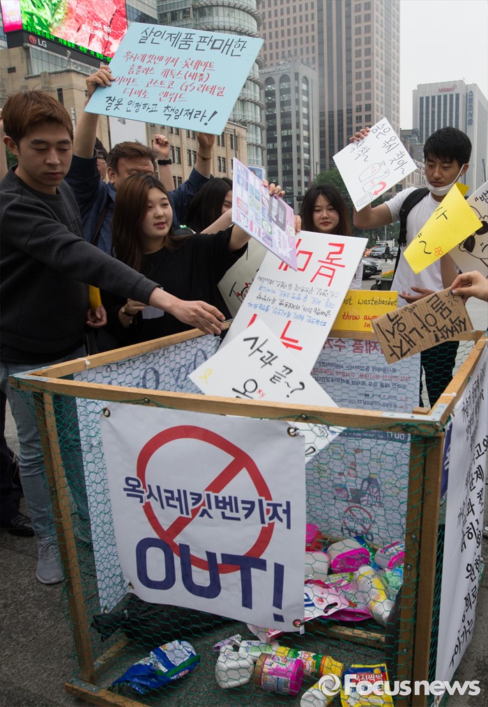 (서울=포커스뉴스) 26일 오후 서울 광화문광장에서 성공회대 학생모임과 청년참여연대 관계자들이 옥시 제품 불매 동참 선언 퍼포먼스를 펼치고 있다.