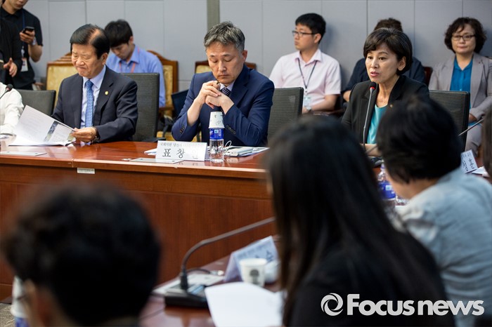 (서울=포커스뉴스) 남인순(왼쪽 세 번째) 더불어민주당 의원이 26일 오후 서울 여의도 국회의원회관에서 열린 '강남역 여성 살인사건의 원인과 대책 긴급 토론회'에 참석해 인사말을 하고 있다.