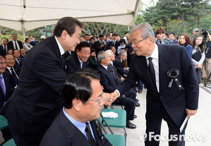 (서울=포커스뉴스) 새누리당 김무성 전 대표와 더불어민주당 김종인 비상대책위원회 대표가 26일 오후 서울 동작구 국립현충원에서 열린 故 김영삼 전 대통령 묘비 제막식에 참석해 악수를 하고 있다.