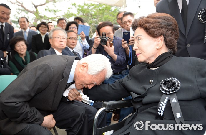 (서울=포커스뉴스) 故 김영삼 전 대통령 묘비 제막식이 열린 26일 오후 서울 동작구 국립현충원에서 최형우 전 내무부 장관이 손명순 여사의 손을 잡고 오열을 하고 있다.